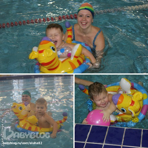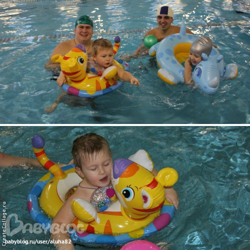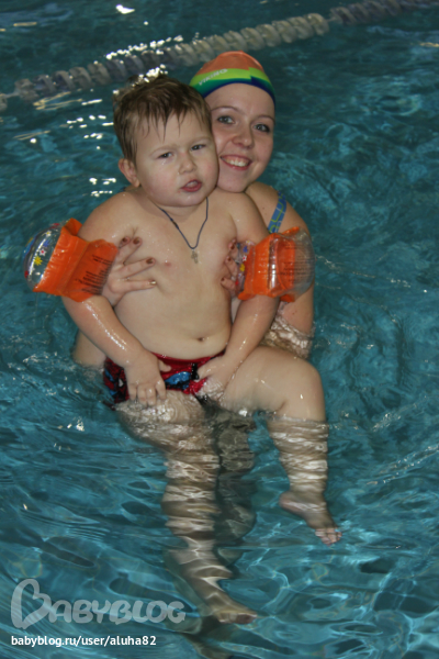 Поначалу мы плавали только в нашем тигренке, а потом тренер принесла нам нарукавники. Я наивная думала, что Славик ни за что не станет их надевать и тем более плавать в них, а он наоборот... Сразу попросил их ему одеть. Каждый раз меня удивляет...