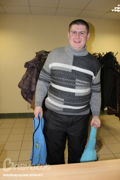 В раздевалке Славена ни в какую не хотел одеваться и бегал и прыгал среди одежды. Потом уже так избаловался, что пришлось папочке Славену нашего ловить. Там кстати на фотографии и малышастик есть.