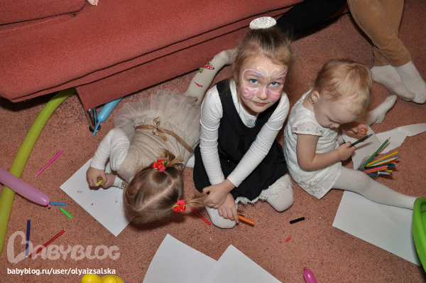 Я немного расстроилась, что меня никто не реагировал на мои просьбы нарисовать самый красивый рисунок или выше всех подкинуть шар, но в принципе я была к этому готова (из опыта недавней елки в Доме пионеров). Именно поэтому не захотела приглашать клоуна, и правильно сделала - маленькие еще, лет с четырех только поймут.