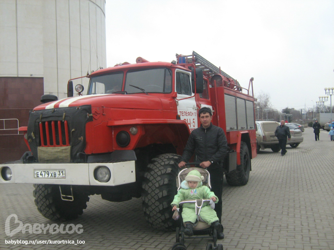 Возле пожарной машины, рассмотрели прям вблизи, а если б еще была мусороуборочная машина - счастью не было б предела!!!