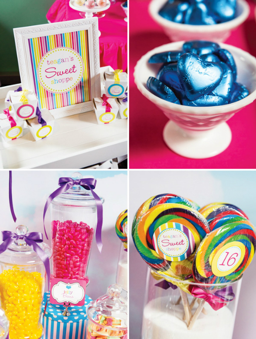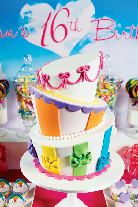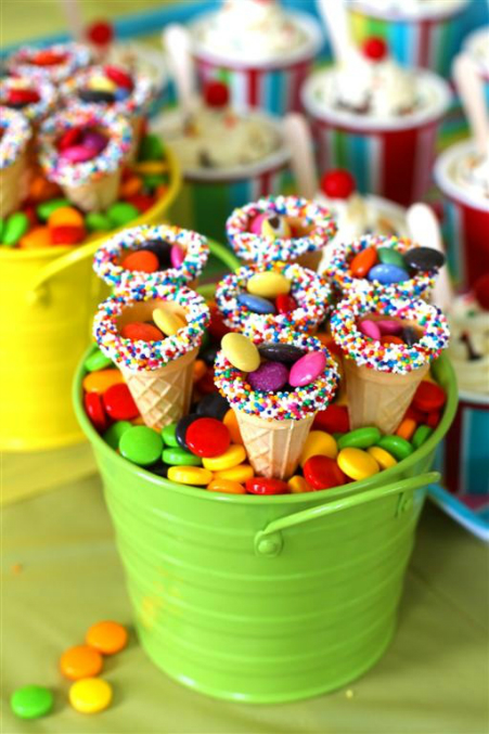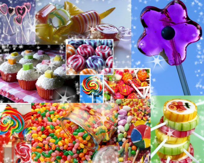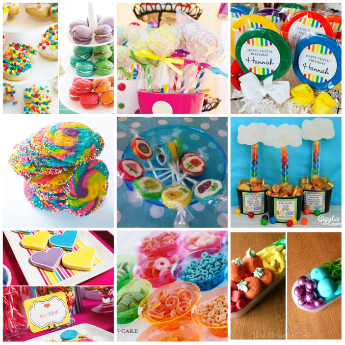у вас на артинка много уже есть)) печнье в глазуре, зиефир, карамель, печенье на палочках, кекпопсы, десертики в стаканах, капкейки, разноцветное желе, мармелад, лимонад или сок в разнацветных бутылках и т.д.))) А начинку торты сделать такой