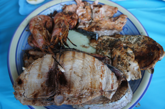 на гриле тунец, красная рыбка, креветки и курочка деткам