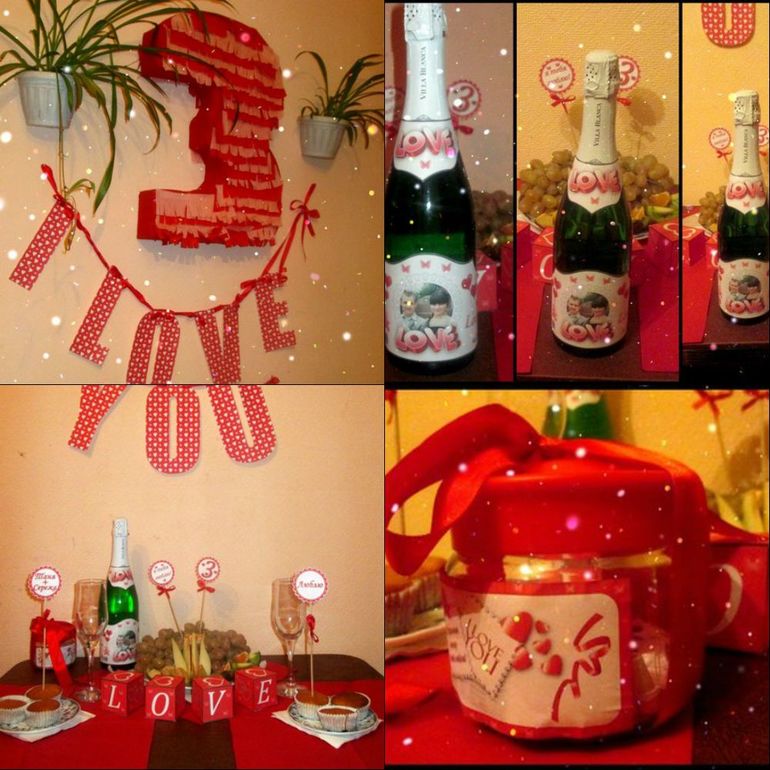 Цифру вырезала из картона, склеивала скотчем, а потом обклеивала гофрированной бумагой( если что поищите в Инете как делают пиньяту) все остальное тоже сама делала, и даже шампансое, если у вас ждет до 18-го декабря, то можете мне личным сообщением скинуть фото, и текст для задней этикетки (у меня там про 3 года напечатано), а я вам скину лист для печати шампанского,распечатаете на самоклейке и приклеите к бутылке) купите деревянные шпажки (палочки), нарисуйте на картоне одиноковой формы кружки, сердечки, сделайте надписи, вырежете и склейте клеем), а гирлянду можно вырезать из красной цветной бумаги или картона)))
