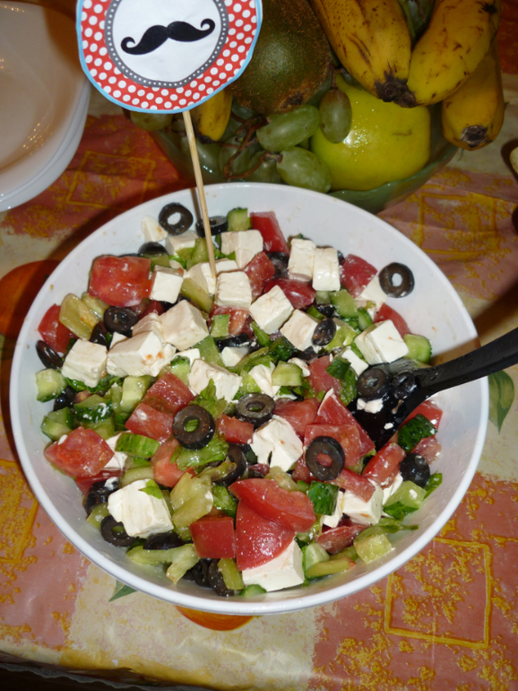 Салат "Греческий"-огурцы, помидоры, болгарский перец, маслины и сыр "Фетакса" (или брынза).