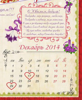 3. Список памятных дат Вашей семьи. Дни рождения, дни свадеб и т.д. Я обвожу эти даты в сердечко и пишу стандартное поздравление. Например: 29 декабря - день рождения бабушки, юбилей. В календаре это будет выглядеть вот так:![]()