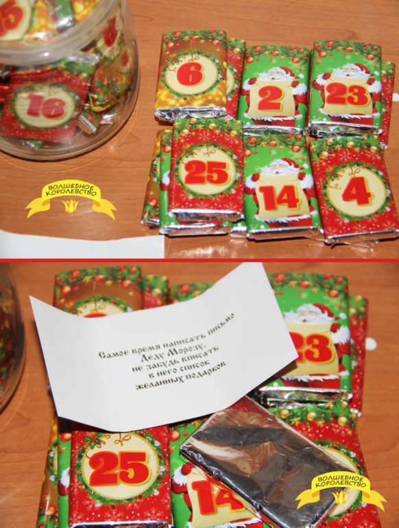 А этот адвент календарь с шоколадками сделала для дочери подруги, она постарше, ей будет интересно, каждый день начина я с 1 декабря съедать шоколадку и выполнять задание