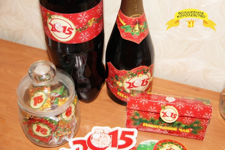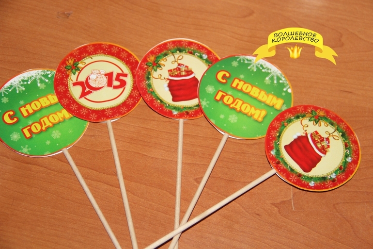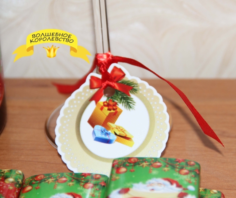 На ножки бокалов вот такие снежинки, но они не простые у всех будут разные картинки, означающие небольшое задание на протяжении новогоднего вечера.