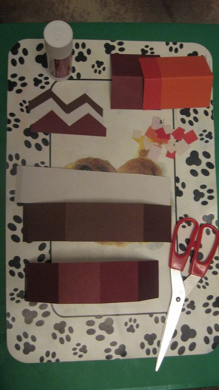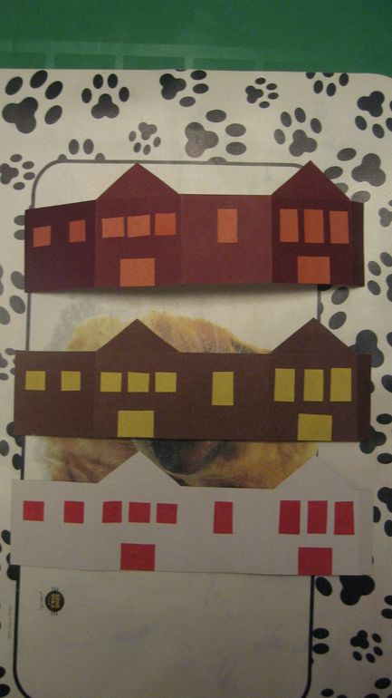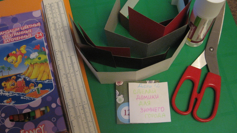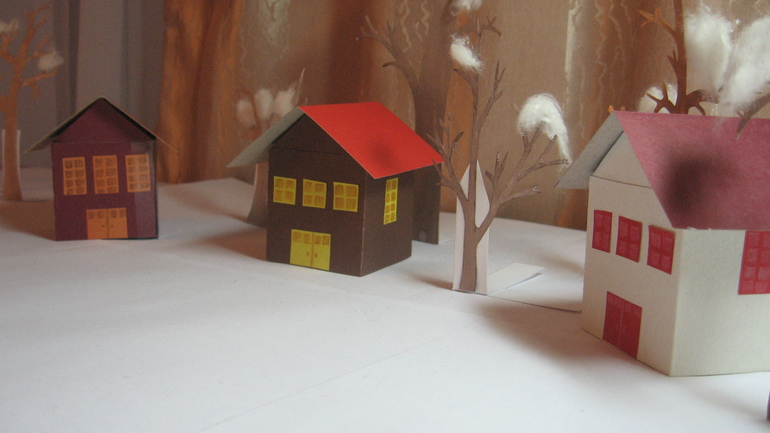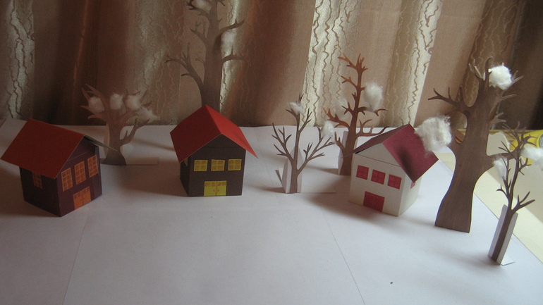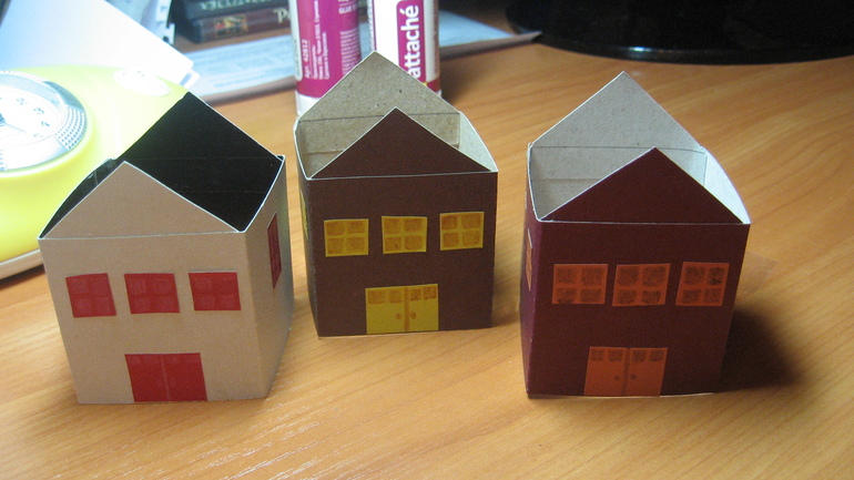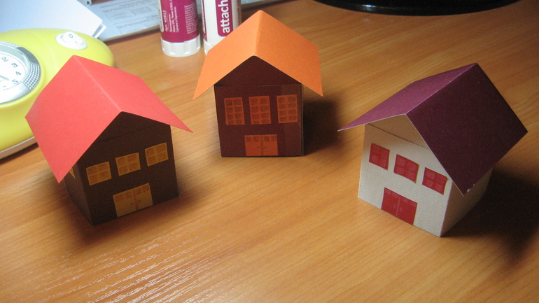 Складываем домики (можно закрепить скрепкой, можно заклеить липкой лентой. Клей не стали использовать, чтобы потом можно было легко разобрать и сложить).