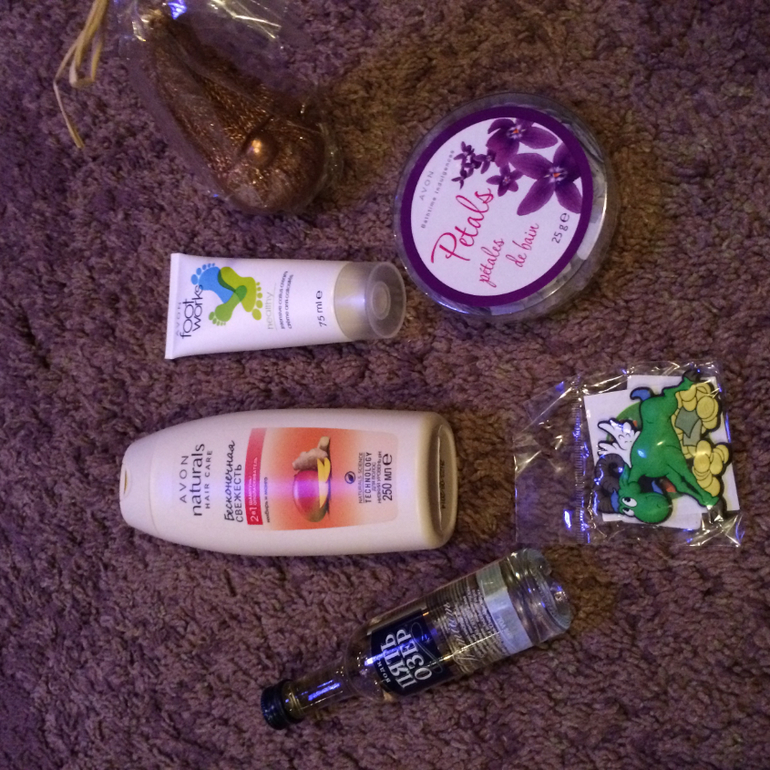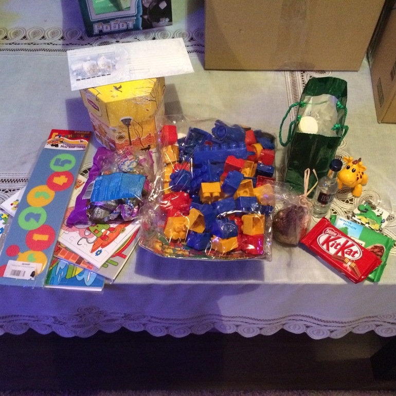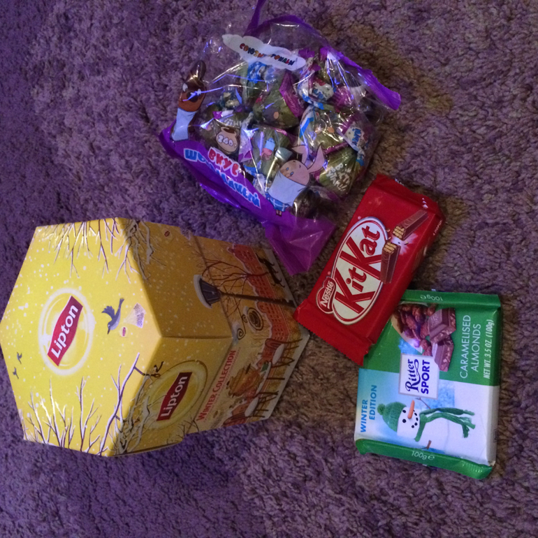 Из сладкого мы получили вот такие конфетки, шоколадки (их уже нет :))))) и чаек, чтоб пить со сладостями. Свят был очень рад такой красивой коробке чая, носился с ней весь день и сейчас тоже бывает утаскивает с подоконника и играет....