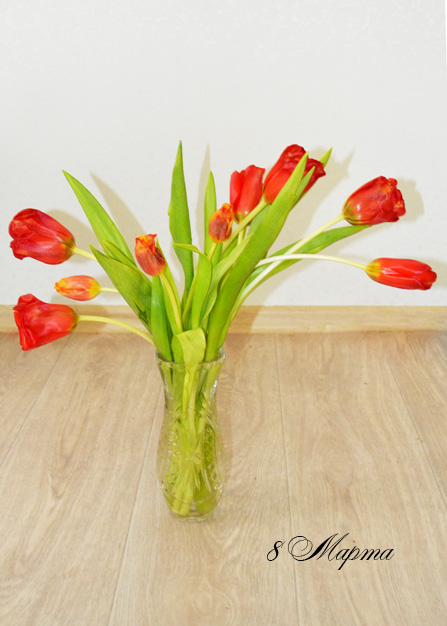 Утром мои любимые разбудили меня цветами.Муж подарил белую розочку,очень красивую.А мальчишки каждый прибежали со свои букетиком тюльпанов