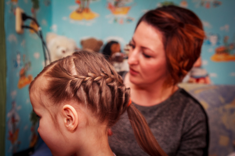 5. Потом пришла наша парикмахер, сделала маникюр и заплела косы(заранее я купила лаки, в цвет пижамок, блёстки,наклейки и одинаковые резиночки для волос), параллельно шли игры, сдуй шарик(шарик ложили на видное место, потом раскручивали и надо его сдуть :)