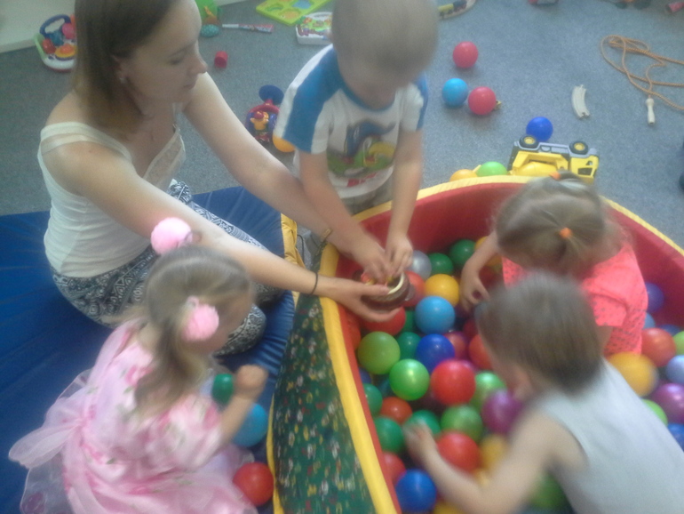 Ну и пчёлы, конечно, стали весёлыми…но коварными…кусочки мёда (они же конфетки «Пчёлки») пчёлы спрятали в бассейне с шариками…и дети дружно искали и собирали мёд по кусочкам в горшочек…