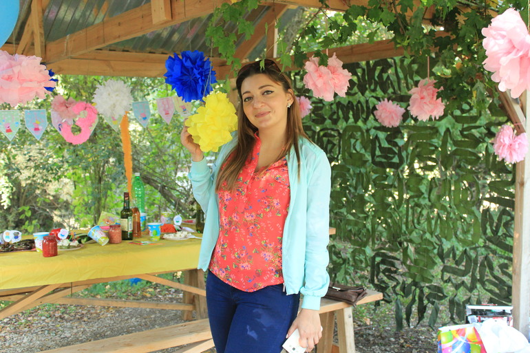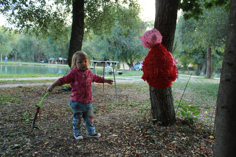 Распаковав начала спрашивать когда поедим на озеро...и как сейчас подарки если она торт еще не задула))) Вот что значит была на днях на день рожденье двоюродной сестры....знает как должно быть. Собрались ....Завезли дочь бабушке и поехали украшать место провидения!!! Было заготовлено много помпонов, тройка и пеньята в виде Свинки Пеппы....растяжка и украшение для трубочек с ней же: Фото с природы стола только такое с подругой: