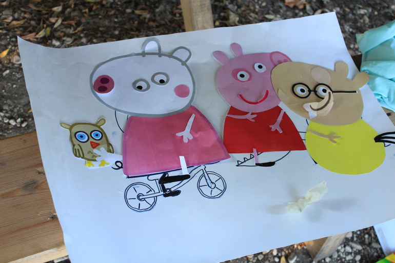 Потом помоги переправить друзей Пеппы без рук на другой берег....Планировалось что папы сделают детям кораблики те их раскрасят....а потом переправят. Но один был занят шашлыком второй делал удочки для следующего конкурса ну и как итог...папы дали детям пластиковые шашки и в них дети дув переправили друзей пеппы...