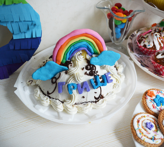 Печенье покупала готовое,украсила айсингом,радужной посыпкой и цветочками мастичными.Тортик очень вкусный-Панчо,тоже сама украшала))еще была красивая свечка 5,радужные конфетки)).Свечку ,как всегда,задували все дети по очереди,это уже почти традиция.
