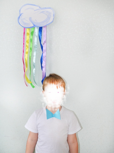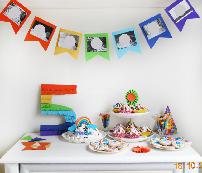 Он с нетерпением ждал гостей.Было 7 человек.я попросила всех детей одеть белые футболки,припасла для них бумажные галстуки-бабочки,на фото их видно,они лежат на комоде, как раз по цветам радуги.Прицепила их детям)).Комнату немного украсила,сделала бумажные облака с радужным дождем из лент,к сожалению меня не оказалось всех нужных цветов,но нужный образ получился)).Цифра 5 радужная.Цветные колпачки.