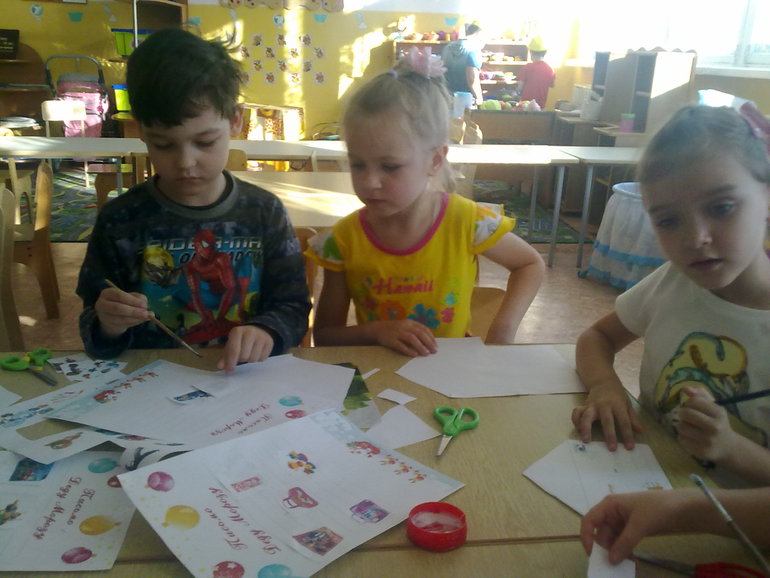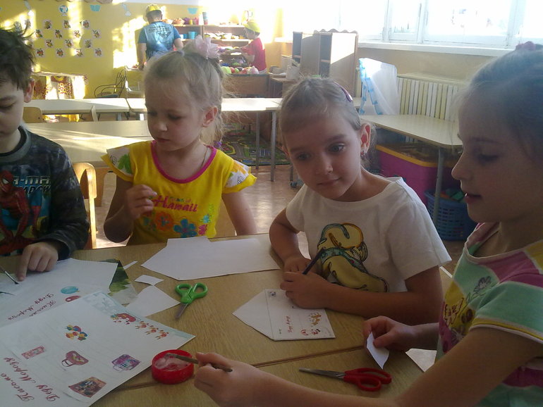 Я заранее приготовила распечатанные листы для писем, конверты,которые детки должны были изготовить сами.И так как еще не все детки умели писать,то я на отдельных листах распечатала картинки с всевозможными игрушками для мальчиков и для девочек...Нужно было выбрать то что ребенок хотел,вырезать и приклеить на лист письма.Затем вырезать конвертик,склеить его и подписать.Далее положить письмо в конверт и запечатать.