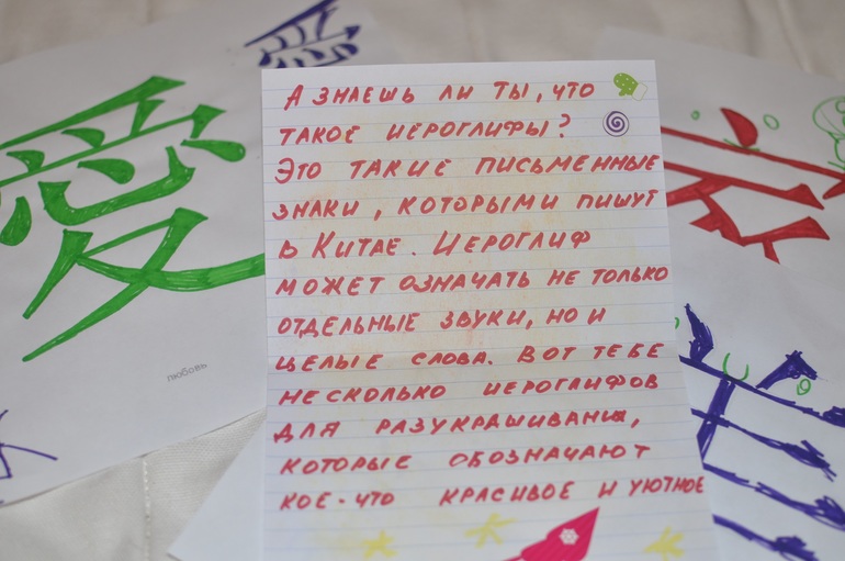 в интернете нашла раскраски иероглифов,которые обозначают семья,любовь,счастье))распечатала,разукрасили их,а потом попытались повторить написание))дерзайте))