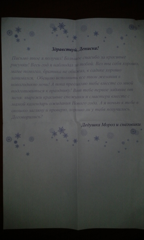 Новый ГодНеделю назад мы с моим пятилетним сыном Денисом написали письмо деду Морозу! Так как писать Деня пока только учится, то все пожелания были выражены в виде рисунков. Как полагается, письмо мы опустили в почтовый ящик и стали ждать.... ответа от дедушки!!! Да-да, сын ждал именно письма с далекого севера)) в том году у нас уже велась переписка с Морозом Ивановичем, но в этом я сомневалась, стоит ли её затевать... Все-таки Денис подрос и уже все понимает и задается множеством вопросов (например, почему ему письма приходят, а другим нет?!). Но, раз уж ребёнок начал ждать, деваться некуда... Пришлось дедушке держать ответ;)