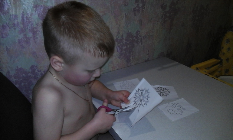 Задание на первый вечер: вырезать снежинки и смастерить календарик ожидания НГ. Шаблоны прилагались к письму. Дениска приступил к выполнению миссии с огромным воодушевлением!