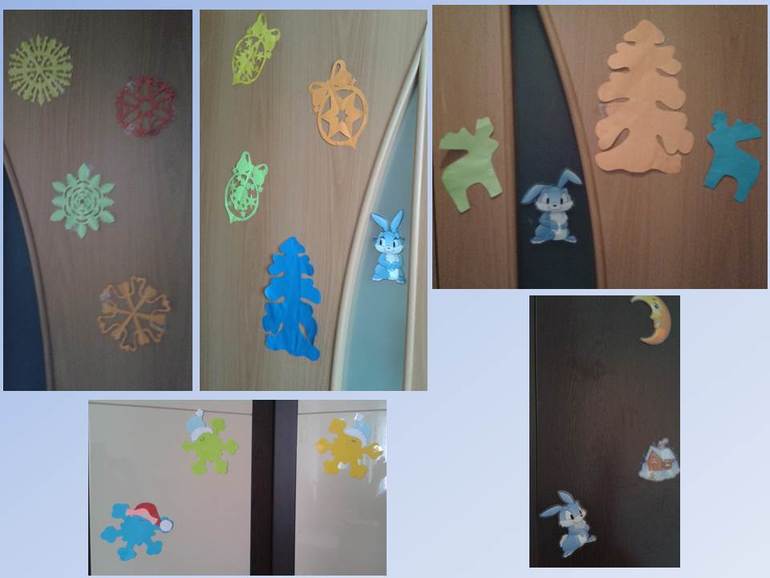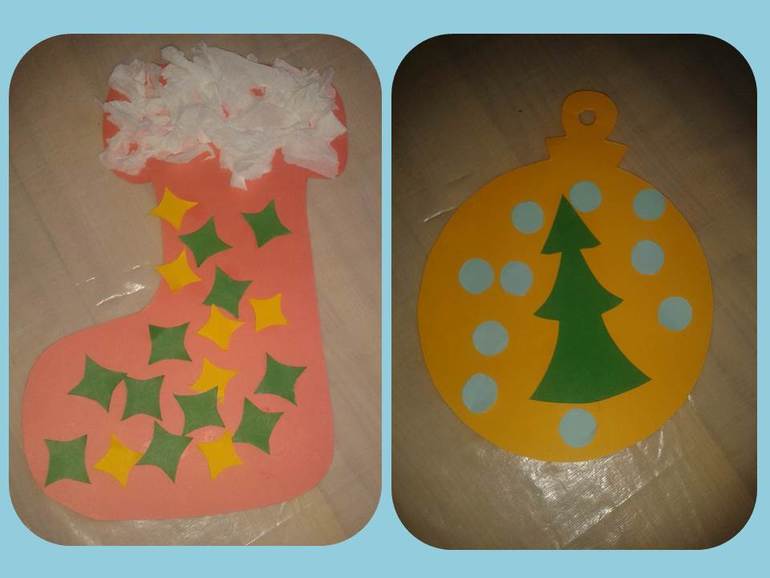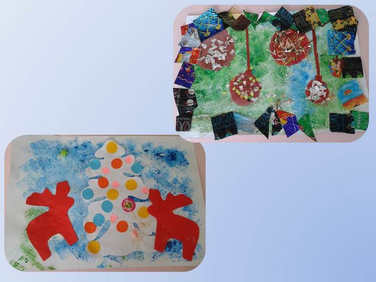 На тех листах, которых мы рисовали губками, мы сделали аппликации: новогодние шары в рамке из фантиков
