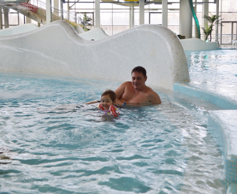 Дочка, по-моему, до самого захода в воду не верила, что это возможно) А потом... четыре часа купания, плескания и катания с горки заставили поверить настолько, что увести Леру удалось только дав обещания, что сейчас еще будет лабиринт с батутом, пока мама с папой выпьют чай в кафе)))