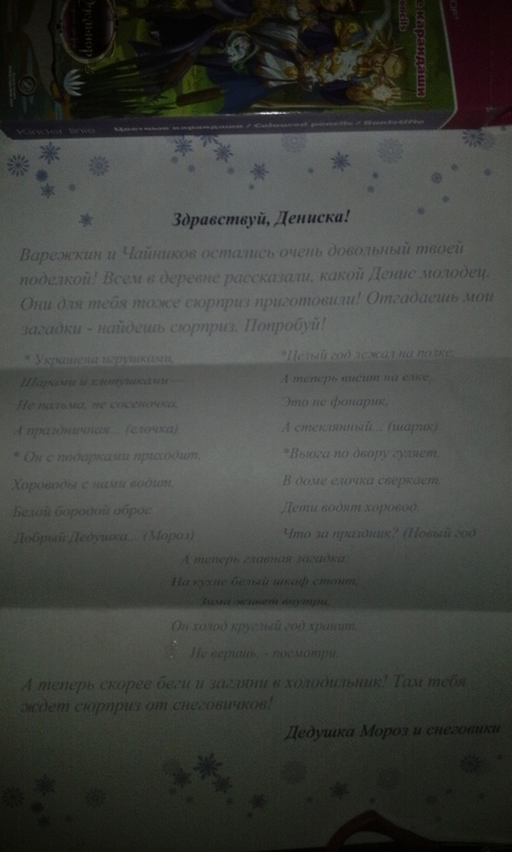 Новый ГодПроснувшись, Денис первым делом бросился к окну. Там его ожидало новое письмо!! Не перестаю удивляться, как сильно он радуется посланиям Мороза Ивановича! Так как день сегодня у нас крайне насыщенный и на поделки совсем нет времени, то решено было максимально упростить задание от дедушки. Я остановила свой выбор на загадках. Дениска оценил;)