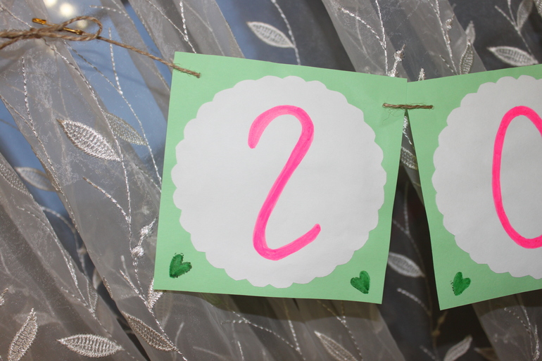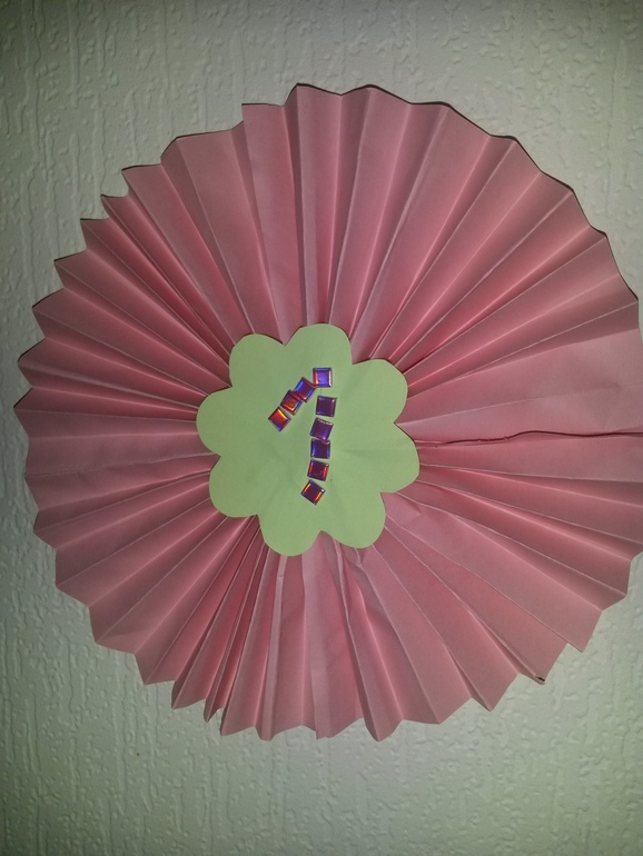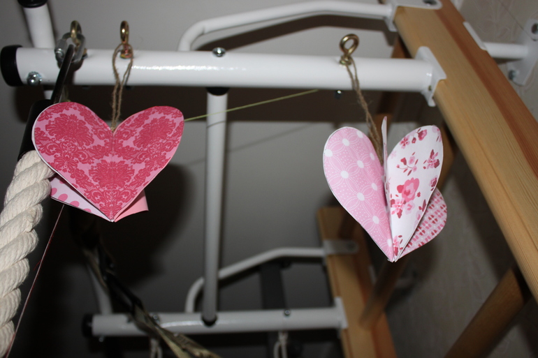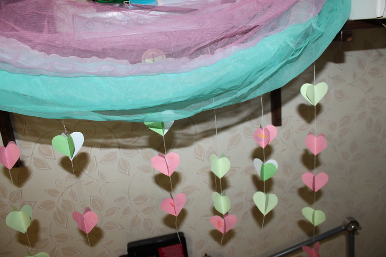 Бумажные веера с сердечками и цветами в зале и коридоре. Наклеечки наклеивала Варенька