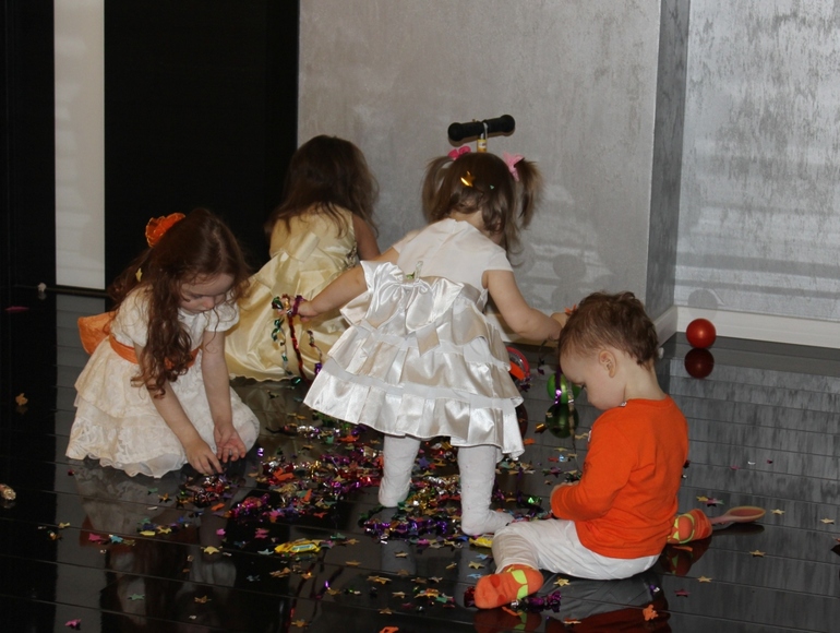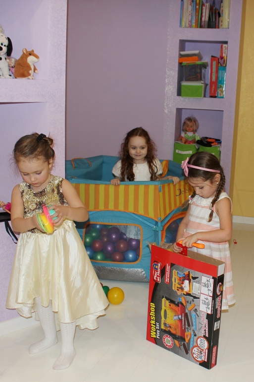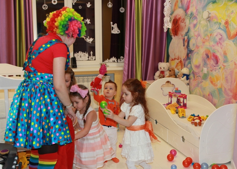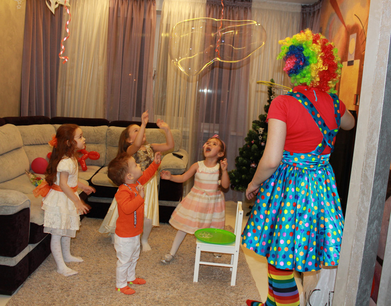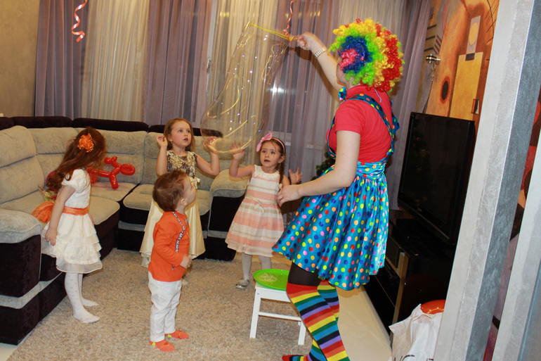 Аниматор пришла через 30 минут после начала. Как раз все детки собрались, переоделись и были готовы веселиться. Зря переживала, что сын испугается - прыгал и скакал вместе со всеми, даже пытался выполнять задания (насколько он их понимал)
