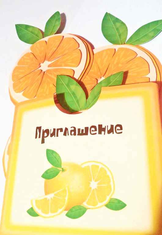 Наши пригласительные в виде объемного апельсина. Каждое вложено в индивидуальный конверт и ароматизировано (!). Муж сразу сам захотел развезти всем гостям.