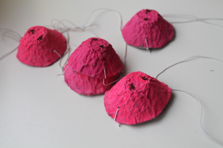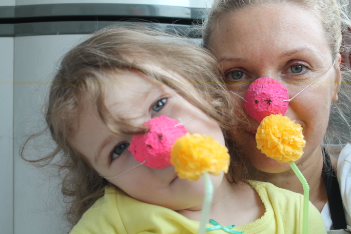 Материалы как всегда незатейливые: картонная коробка из под яиц+ножницы+розовая гуашь+нитки-резинки+обязательно два непоседливых ребёнка!