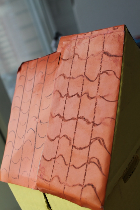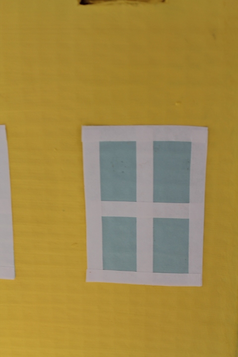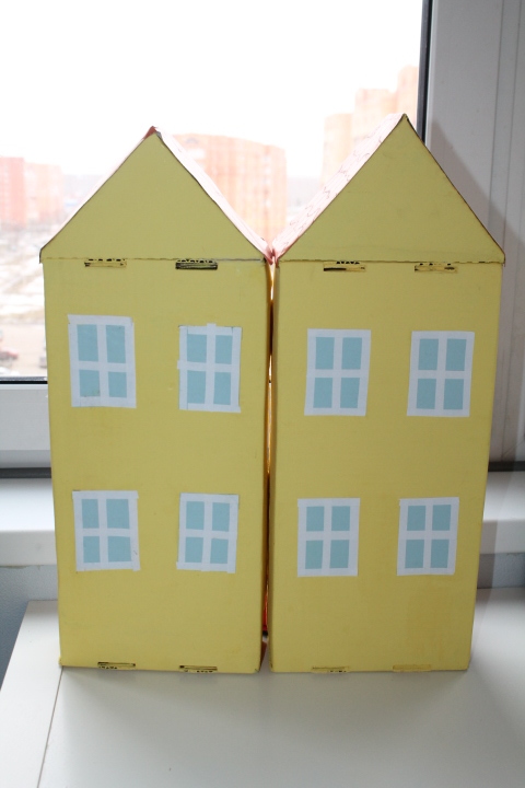 Домик делали из картонных лотков из под творожка "Вкусный день". Ушло 3 лотка. Краска водоэмульсионная+кисточки+желтый колер+ножницы+клей+двое детей=картонный домик Пеппы. Из икеевской голубой бумаги вырезаем окошки, из белой - оконные рамы, из цветного картона дверь и крышу. Приклеиваем. Разрисовываем где надо.