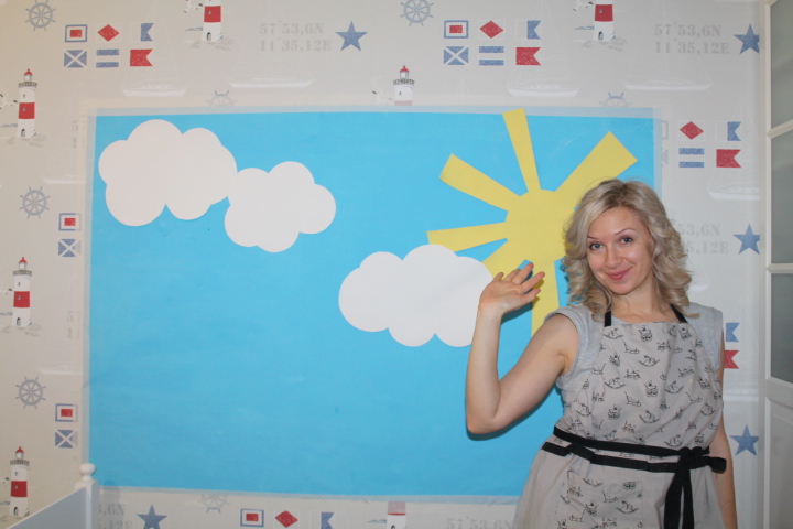 Из картона вырезаем круг - это солнце и его лучики. Красим водоэмульсионкой заколерованной в жёлтый цвет, приклеиваем на двусторонний скотч. Облака вырезаем из белого картона и тоже ляпаем на двусторонний скотч.