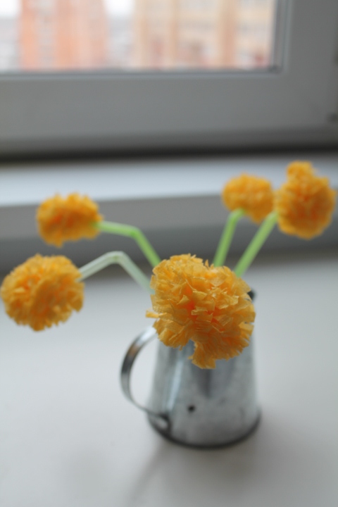 Делаем очень быстро и легко. Материалы: трубочки для сока (ИКЕЯ)+желтые салфетки+ножницы+нитки с иголкой+степлер.