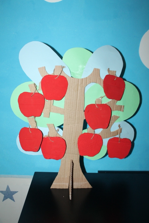 Из гофрокартона вырезаем "дерево" по контуру канцелярским ножом. Из цветной бумаги (у меня ИКЕЯ) - листву, также из гофрокартона - яблочки. Дети их раскрашивают красной гуашью. Пробиваем шилом дырочки, продеваем веревку, вешаем на ветки. Дерево готово!
