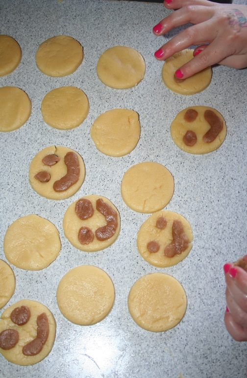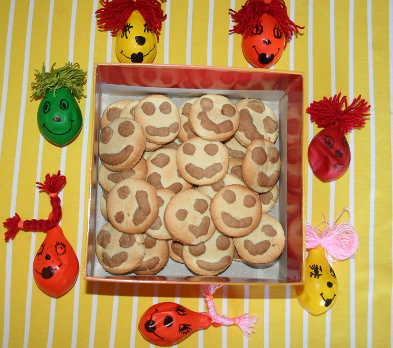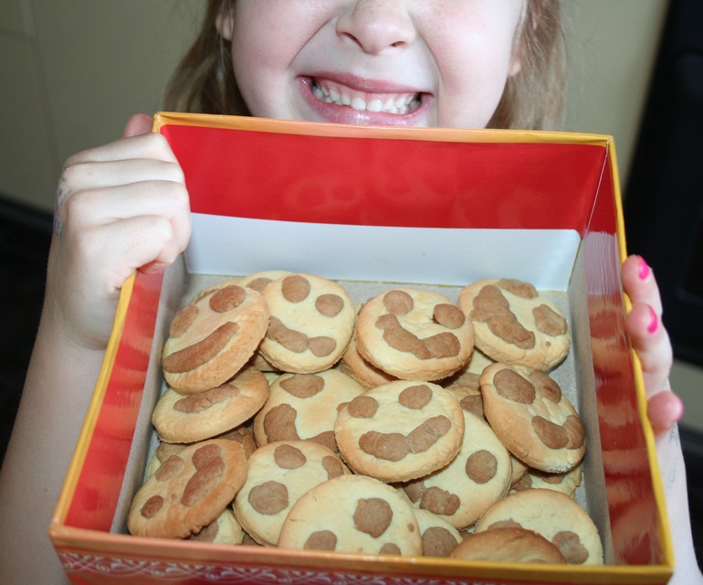 Напекли сегодня для Каминых друзей на акробатику коробочку печенек-улыбашек по моему самому любимому рецепту. Чтобы сделать глазки и улыбки, в небольшой кусочек уже готового теста добавили какао-порошок. Мне очень понравилось, что почти все мордочки Камилка сделала совершенно самостоятельно, я только тесто замесила :-)