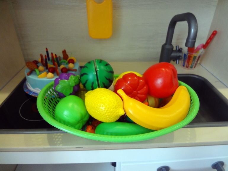3.Фрукты/овощи пластиковые, простые и которые можно резать. Разрезные дочке очень нравятся. раскладывает кусочки по тарелкам и кормит кукол и всех вокруг