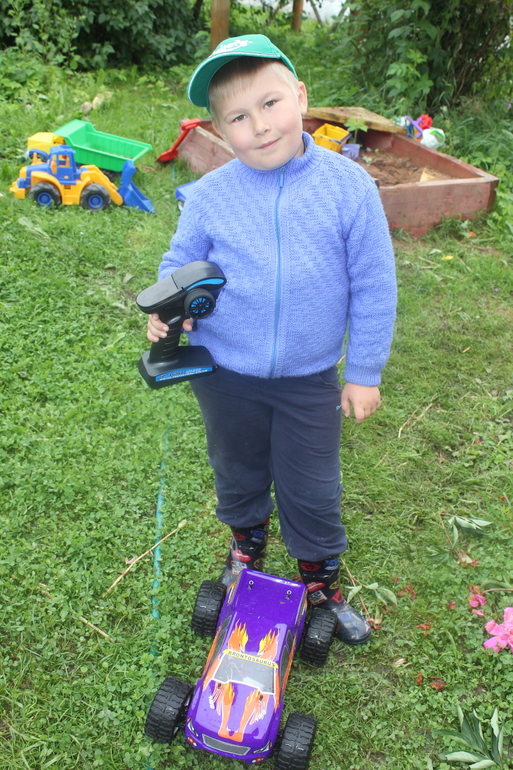 Машинка на пульте от друга Матвея из садика. Теперь вот катает ее на даче Славик и каждый раз вспоминает, какой хороший подарок ему сделал Матвей.