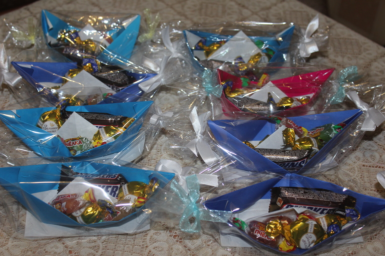 И вот наступило наше время благодарить гостей... в подарок мы гостям приготовили лодочки с конфетами...