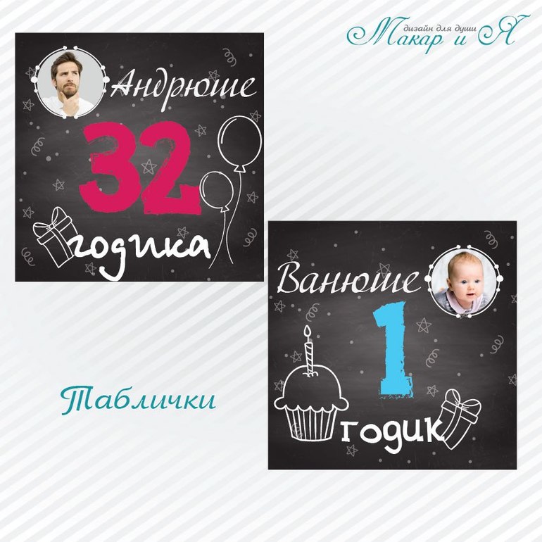 Так же была сделана растяжка и топперы) А изюминкой стали праздничные таблички с фото, именами и возрастом, которые украсили стол. (Фото изменены)