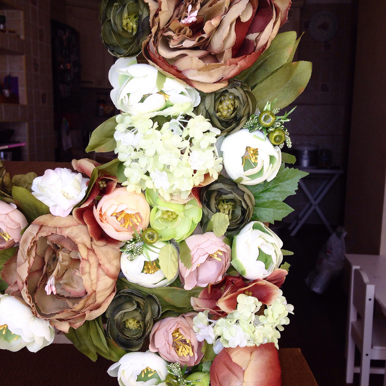 Острым ножом или скальпелем в цифре делаете дырки, прям в дырку клея из пистолета и цветок туда ножкой вставляете. Для больших цветов я вырезалабольшую дырку сантиметров 8-10 в диаметре, по краю дырки клеи и цветок большой прям туда утапливала. И ту сторону на которую цветы клеила крепбумагой не обклеивала.