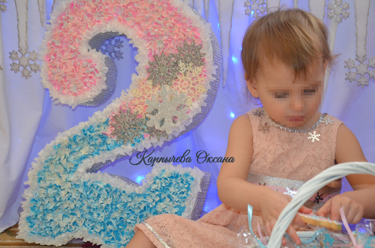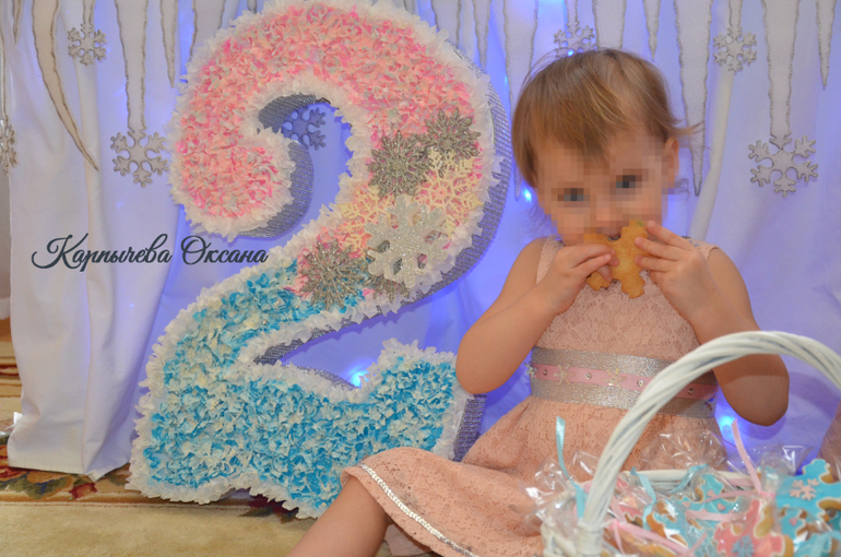 Итак, с темой второго дня рождения я определилась буквально сразу после нашего пчелиного годовасия тут, мне хотелось чего-то нежного и снежного, а с учетом моего творческого задора, я уже была вся в предвкушении что же получится в итоге))) Поэтому еще на пасху я купила различную присыпку в нужной цветовой гамме (по опыту прошлого года, в другое время года ее очень трудно найти). Летом я заказала снежинки из пенопласта у нас на базе, которая занимается товарами из пенопласта (как Вы понимаете на снежную тематику летом хорошие скидки, поэтому кто захочет делать праздник на подобную тематику ну или то же "Холодное сердце", то я бы советовала покупать подобные вещи не в сезон) Далее так же летом я заказала товары на али: палочки для кейкпопсов, вырубки снежинок, наклейки для приклеивания воздушных шаров к потолку, креповая бумага, ткань голубая на стол, ленты атласные, ленту из страз, блестки, трубочки, снег на стол, юбочки для кексов. Далее в сентябре-октябре я получила посылки, была довольна всем, но блесток взяла мало, ну об этом позже))) Активная фаза подготовки началась за два месяца до праздника, начала я как и в прошлом году с цифры,