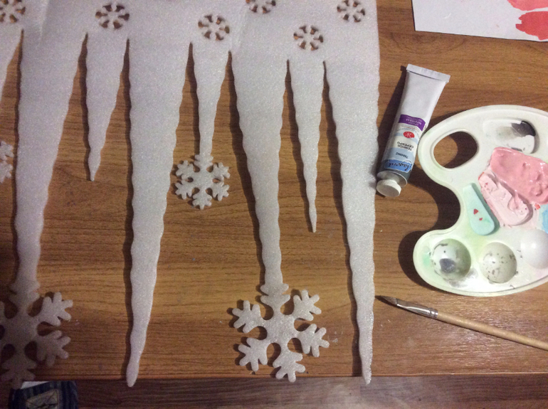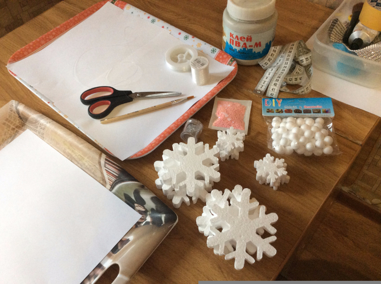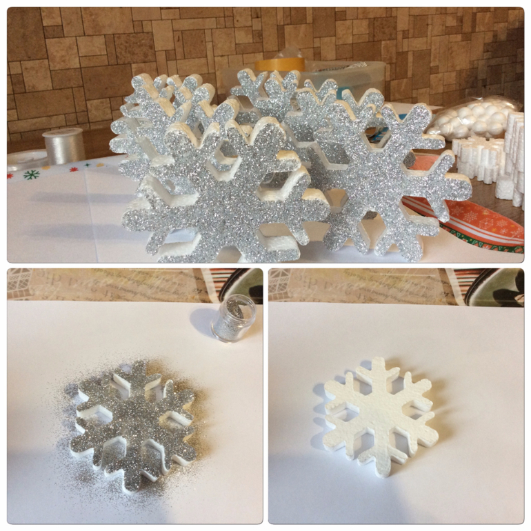 мастер-класс по ее созданию тут на этот раз все было очень быстро и за два дня она была полностью сделана. Далее пришла пора украшать снежинки из пенопласта, изначально задумка была сделать их все плотно покрытыми блестками (для этого покрывала клеем пва и присыпала блестками), но к сожалении этого количества блесток мне хватило только на 8 штук, с оставшимися я вышла из положения смешав канцелярский прозрачный клей с блестками и сделала на снежинках подобие блестящих капель.