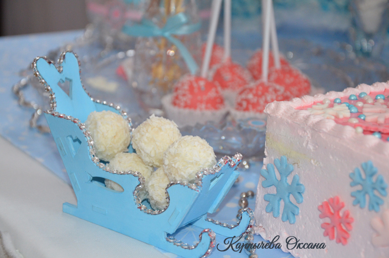 За день до праздника испекла сливочные кексы, украсила их белковой глазурью, присыпкой, мастичными снежинками и сделала кейкпопсы (внутри сгущенка и бисквит, в белом шоколаде), с тортом решила в этом году не возиться, по опыту прошлого года, он отнимает много времени, а нужно ведь еше приготовить основные блюда на стол))) поэтому заказала готовый розовый торт без украшений и уже украсила его на свой вкус теми же присыпками и мастичными снежинками)