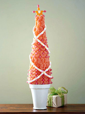 Дерево из сухофруктов. Эту елку сделали из засахаренных сушеных долек апельсина, которые прикололи деревянными зубочистками. Пустое место между дольками можно опять-таки заполнить жевательными конфетами, круглыми леденцами и тому подобным, что подойдет вам по цвету и размеру. Гирлянда на елку сделана из нанизанных на нитку конфет-суфле.