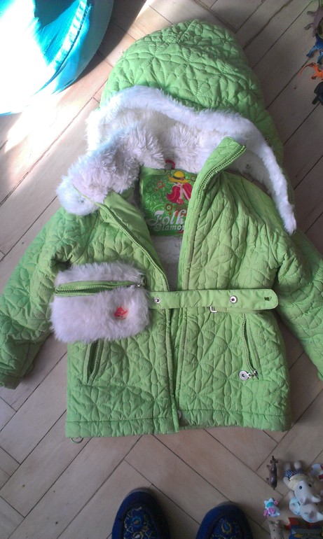 8 Куртка весна-осень. Длина 46, длина рукава по внутреннему шву 27. Можно носить до роста 108.Цвет ярче,чем на фото.До середины спинки мех. На поясе одна кнопка потеряна, это не мешает. Экв 450