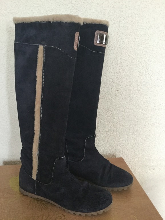 Сверху-темно синяя замша, внутри мех в районе стопы до щиколотки. Высота- до колена, на среднюю полноту.