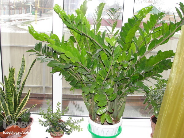 Это моя гордость - замиокулькас. купила в 2007г было 7 листочков, в 2010г рассадила на два горшка, и так они сейчас разрослись:)