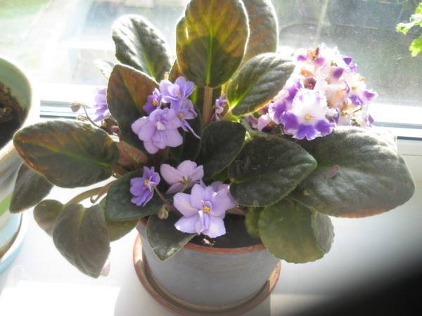 Сначала в горшке росла фиалка синяя, я потом посадила к ней тоже синию ( она с большими листьями) . Вот что получилось . Она стала Бело-сиреневая.