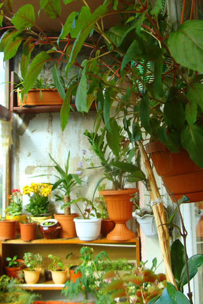 а вот так выглядит одна сторона моего балкончика живущих летом там цветочков) на переднем плане ужасно обильнорастущая фуксия, чувствую что к осени я буду думать куда б этот куст повесить)))